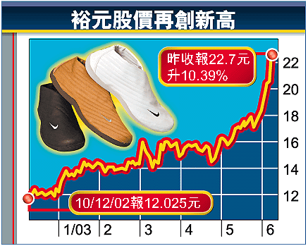 【本報訊】全球最大運動鞋生產商裕元工業(551)去年度業績優於市場預期,多家證券行紛紛調高其03年度全年盈利預測,並維持「買入」投資評級。裕元股價昨日亦再創新高,收報22.7元,升10.73%。自5月中宣布裕元將成為恒生指數成份股以來,其股價已上升逾33%。
