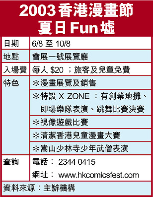 今年「2003香港漫畫節夏日Fun墟」一如過去四屆在會展舉行,會場佔地十二萬呎,共有四百個展覽單位。漫畫節行政總裁梁中本昨日在記者會上表示,主辦機構將聘用約一百名臨時人員,另估計參展商會將設八百個臨時職位。