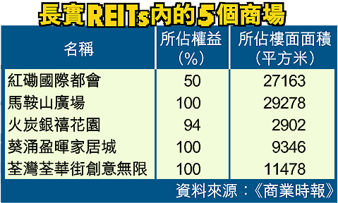【本報訊】新加坡報章《商業時報》引述消息人士指,長實(001)正考慮將本港5個零售商場,以地產信託投資基金(REITs)形式分拆在新加坡上市,涉及資產約值36.15億元,預期回報率約7%。證券界認為,長實以REITs形式分拆旗下投資物業的計劃,將陸續有來。