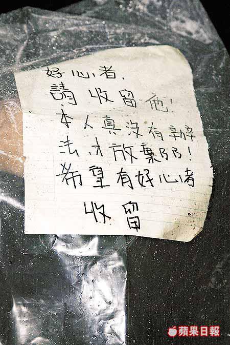 【本報訊】父親節前夕,粉嶺祥華邨發生棄嬰案。一名出生剛滿一周男嬰遭狠心父母遺棄,男嬰飢寒交迫哇哇大哭,驚動好心人發現報警。警員冒雨把男嬰送院檢查,並在現場撿獲一張懷疑是男嬰父母遺下紙條。上寫:「……本人真沒辦法,才放棄BB!希望有好心者收留」。警方呼籲男嬰父母盡快聯絡警方認回兒子。 記者:宋光明