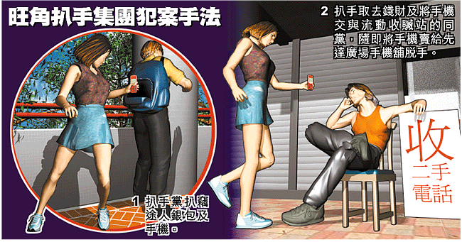 【本報訊】警方經過長時間跟蹤監視,昨午採取代號「利刀」的行動,一舉瓦解一個一條龍式運作活躍於旺角區的扒手集團,在多條繁盛街道及一個以收買二手電話作掩飾的流動檔口,以及旺角先達廣場部份售賣手提電話的店舖,先後拘捕二十八名男女,其中一名當場被捕女扒手年僅十三歲,行動中警方在收贓站及手機舖搜獲一批懷疑手機贓物,懷疑有人為扒手集團銷贓,將偷來的手機改頭換面後在店舖銷售。 記者:盧志光、劉達堯
