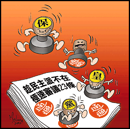 【本報訊】立法會用了超過一百小時,仍然無法解決《基本法》第二十三條藍紙草案中涉及人權、法治的問題,但保皇黨議員竟趁民主派缺席會議的「大好機會」,只用了五個多小時便匆匆完成逐條審議草案;而為求阻止民主派日後「翻案」,保皇黨更不惜打破議會慣例,投票通過決議,禁止草案委員會日後再進行逐條審議。