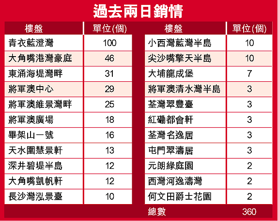 剛過去的周末,各大新盤沽出360個單位,當中藍澄灣佔100戶。