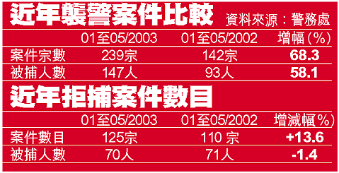 曾蔭培昨日表示,今年首五個月有關襲警案件高達二百三十九宗,平均每個月發生四十七宗、每日至少一宗,較去年同期的共一百四十二宗,急增近七成。他強調,非常關注近月增加的襲警及拒捕情況,並聲言:「呢啲不法行為唔可以接受、容忍,我哋會採取果斷拘捕行動去處理。」