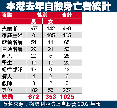 撒瑪利亞防止自殺會執行委員會委員簡柏基昨在記者會上表示,根據死因庭聆訊的自殺案件,去年共有一千零二十五人自殺死亡,其中四百九十九名為失業者,人數較前年增加超過三成。簡柏基解釋,若長時間找不到工作而令經濟出現問題,或令失業者失去自信,他們很容易會產生自殺的念頭。由於近年經濟未有起色,而就業情況持續惡化,所以自殺身亡的失業人數持續上升。