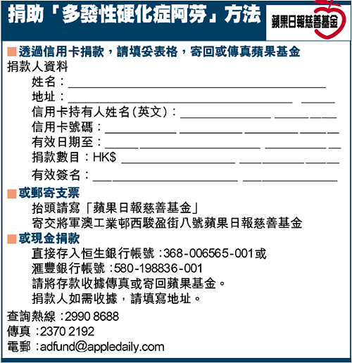 四十三歲患有多發性硬化症的阿芬,不良於行,多年來依靠四腳坐行架出入。近年,其四肢的活動能力日漸衰退,生活起居全賴其任職運輸工人的丈夫照顧,職業治療師建議她購買一部價值三萬七千多元的電動輪椅,方便出入。惟生活貧困的她,無力支付購買電動輪椅的費用,急待善長伸出援手。