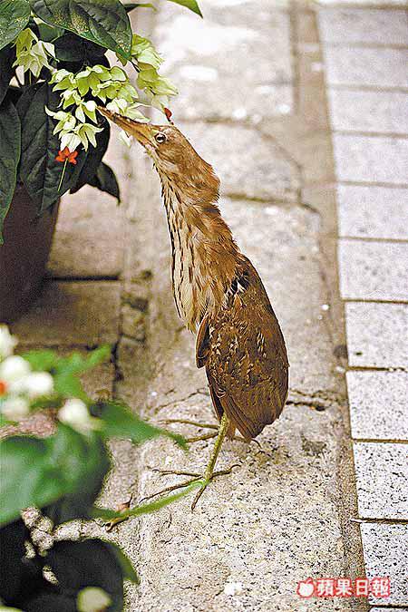【本報訊】一隻由中國東南方來港繁殖的候鳥黃斑葦鳽(YellowBittern),昨日誤闖將軍澳「石屎森林」。上午十一時許,市民發現一隻約一呎高、右眼受傷、身體瘦弱的小鳥伏在浩明苑一個花槽,於是報警。警員小心翼翼捕捉小鳥帶返警署,再交漁農自然護理署人員檢驗,可是途中小鳥突然死亡,漁護署人員懷疑小鳥染病,加上飢餓過度致死,將會調查死因。 據漁護署資料,黃斑葦鳽屬於夏季候鳥,每年五至八月繁殖季節都會來港繁殖,然後便飛返原產地。牠們主要棲息於米埔及后海灣,以捕魚為食。