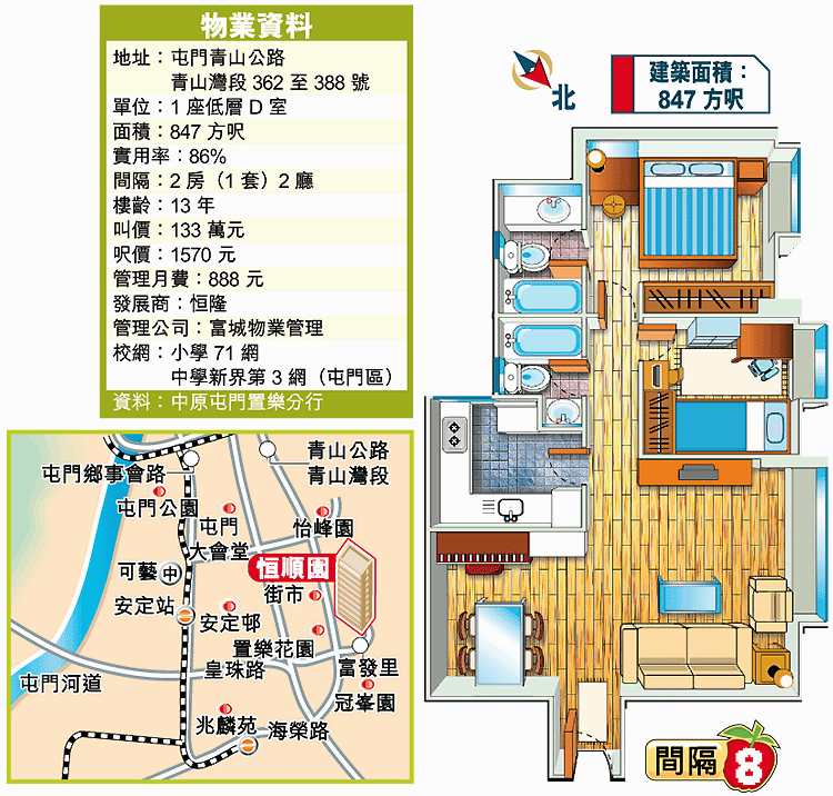 近九成實用率,間隔方正。847方呎只設兩房,叫價僅130餘萬元,以上車盤價錢住大單位,而且裝修雅致,保養簇新,可省下裝修費。物業距市中心及輕鐵站較遠,但附近商舖街市林立,也算方便。