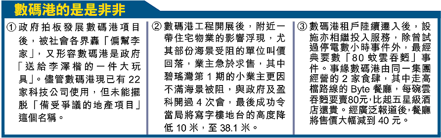 本周五,數碼港正式開幕。這項目由落實興建的第一天起,一直被定性為「備受爭議的地產項目」。直至今天,它已有22家本地及跨國企業進駐,高科技基建設施相繼落成。還有半年便離任的數碼港統籌專員馮程淑儀直言,最大心願(亦是挑戰)是令佔地24公頃的數碼港換回「資訊旗艦」的真面目。 記者:何凱兒