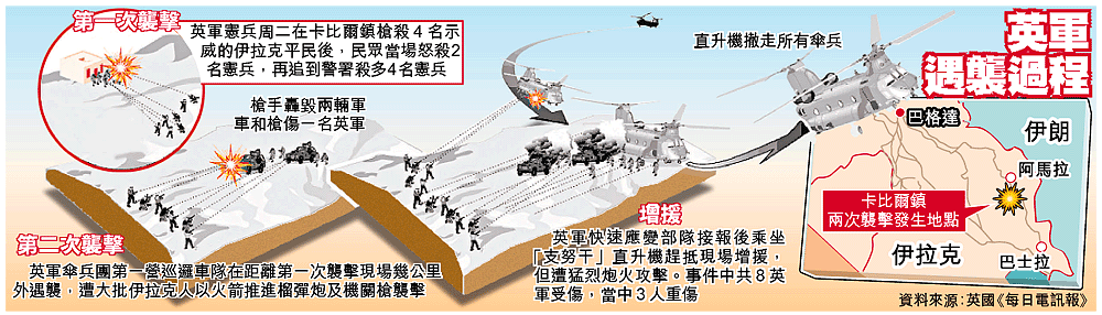 駐伊拉克的聯軍在周二的二十四小時內遭遇二十四次襲擊,當中以距離南部巴士拉市二百公里的卡比爾鎮情況最嚴重,英軍兩度受襲,共造成六死八傷,是聯軍進佔伊拉克以來死傷最多的一次。