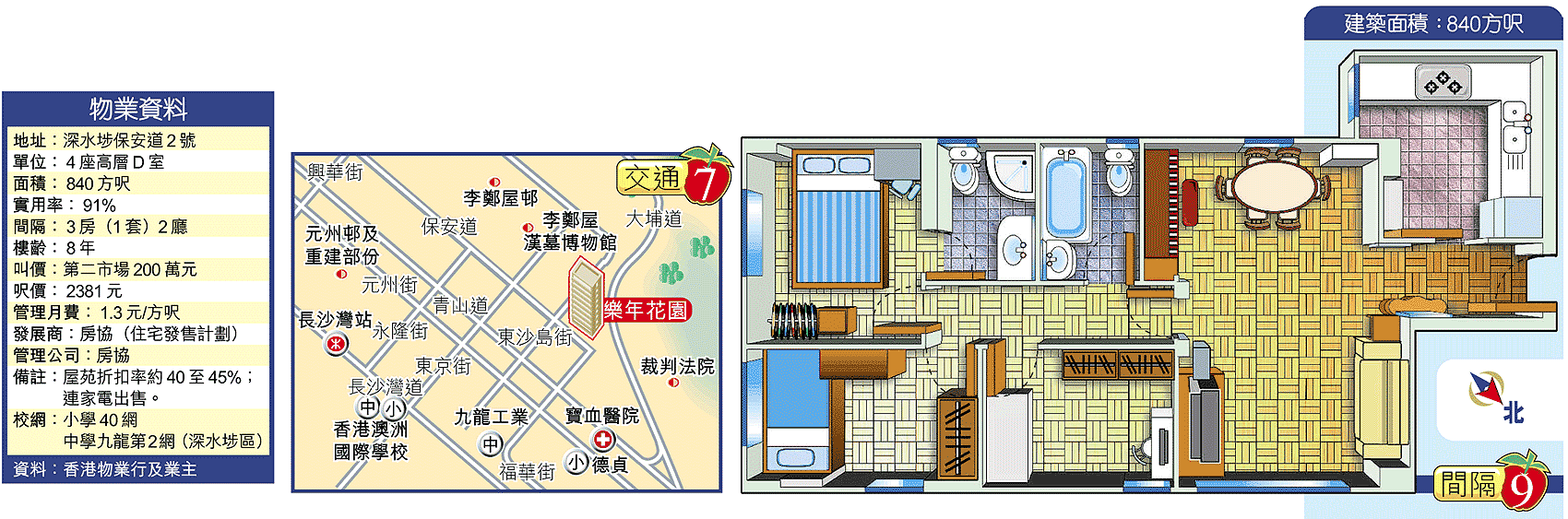 中原地產網上成交紀錄顯示,同類840方呎單位成交個案,要追溯至去年中,4座高層E室,第二市場成交價175萬元,呎價2083元,近期交投則以500餘至600餘方呎細單位為主,第二市場成交呎價約2000元水平。物業折扣率高,因此自由市場交投不太活躍。