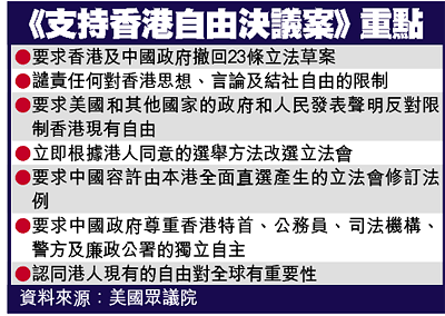 【本報訊】代表美國全國民意的國會眾議院昨以壓倒性票數,通過《支持香港自由決議案》,促請香港特區政府撤回《基本法》第二十三條的立法草案,以免削弱港人的基本權利和自由,並要求美國及其他國家的政府和人民發表聲明,向中國政府和人民傳達支持港人現有自由的訊息。據知英國政府稍後也會發表聲明表示對二十三條的關注。
