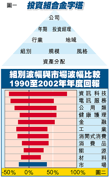 第三,投資組合亦應涵蓋不同市場類別(sector)及行業的投資項目,而且投資比重必須平均,從而減輕風險。香港股市長期地偏重地產和銀行類股份,相比之下,美國股市的市場類別覆蓋廣闊得多。過份集中投資於個別市場類別,涉及高投資風險。就以資訊科技組別為例,圖二顯示於1990至2002年間,美國資訊科技市場組別的年回報率,相差幅度超越其他市場組別,波幅愈大,表示風險愈大。因此投資者應分散投資於不同的市場類別上,以平衡風險及回報。不過投資者須同時注意,即使某個市場類別整體表現向好,亦不表示組別內所有行業均有相同表現。其中一個極佳例子是消閒式消費(ConsumerDiscretionary)市場類別。該類別於2002年下挫24%,其中所包括的27個行業,回報率各有不同,既有報跌30%的汽車製造業,亦有報升13%的家居及商業用品產銷業(Housewares&Specialties)。就算在同一行業內的不同機構,回報率亦不盡相同。就以美國家居及商業用品產銷業內機構為例,NewellRubbermaid於2002年上揚13%,Tupperware則下跌18%。有見及此,投資者宜分散投資於不同市場類別、行業及機構,藉以分散風險。