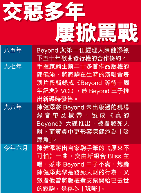 香港搖滾班霸Beyond與前經理人陳健添之間的恩恩怨怨,多年來仍沒完沒了,繼日前黃家強和黃貫中(Paul)公開表示不滿陳健添將黃家駒遺作的版權,賣給新進二人組合Bliss主唱,並力斥對方開支票給家駒似存心「玩嘢」,令雙方掀起罵戰後,陳健添近日又有新動作,令他與Beyond之間的關係進一步惡化。