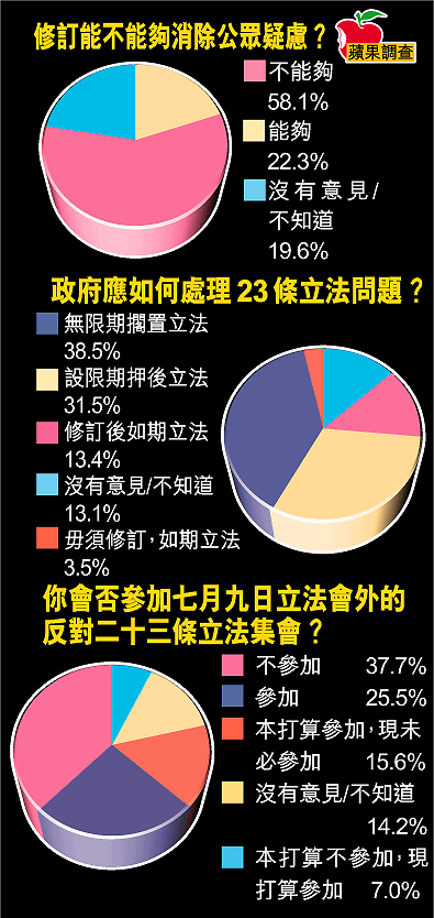 【本報訊】本報昨晚以音頻互動電話系統,成功訪問五百九十七名市民,其中近六成人認為,行政長官董建華就《基本法》第23條所作的三項修訂,不足以消除公眾的疑慮;近四成人認為,港府應無限期押後立法。