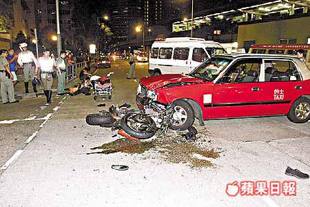【本報訊】一輛被稱為「小赤兔」、深受飆車一族歡迎的YamahaV2TZR250電單車,昨日凌晨零時許,沿牛頭角道往觀塘東行,駛至玉蓮臺一座對開時,對面線一輛的士突然掉頭,電單車收掣不及撞向的士左邊車頭,姓羅(三十九歲)鐵騎士及姓周(二十六歲)男乘客雙雙「人仰馬翻」受傷倒地。 兩名傷者事後送院治理,鐵騎士情況穩定,男乘客亦無大礙。兩名肇事司機事後接受酒精呼氣測試,證實並無飲酒。