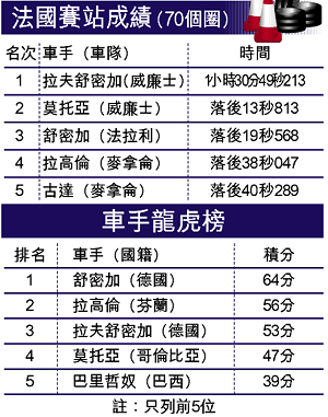 【綜合法國外電】愈戰愈勇的拉夫舒密加,繼上周在世界一級方式程德國站勝出後,於周日的法國站再下一城,首先衝過終點,並連續第二次與威廉士車隊隊友莫托亞包括連贏位。