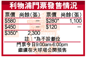 前日開始公開預售的港隊對利物浦表演賽門票,昨晨九時在大球場售票處發售,開售前約有一百名球迷到場輪候,其中只餘二十餘張的四百五十元門票火速售罄;至於三百五十元及二百八十元兩種不設劃位門票,以後者較受歡迎。賽事將於本月二十七日在大球場上演。