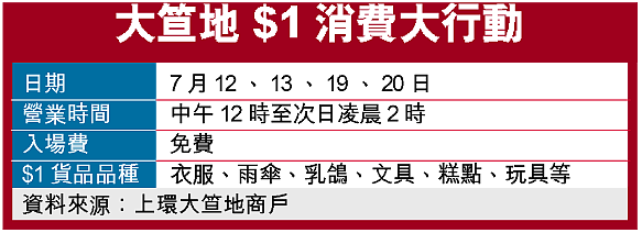 【本報訊】近一百間上環大笪地的商戶,將於本月十二、十三、十九及二十日,在大笪地內舉行一元消費大行動,合共提供數百種只售一元的貨品,包括雨傘、衣服、玩具等。市民更可以用一元的價格作自助燒烤、釣蝦等。商戶表示,是次自發推出這項活動,是為響應港府及旅遊發展局振興本土經濟的呼籲,並刺激市民的消費意欲。