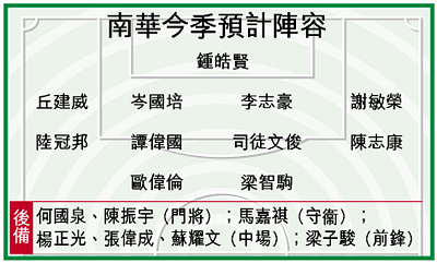 許晉奎昨晨向球員訓話時表明不會給予球隊任何壓力,也會給予時間球員從學習中成長;足主黃鎮南則表示,只要球員肯苦練,有信心保持上季成績。南華上季奪取銀牌及主席盃兩項冠軍。
