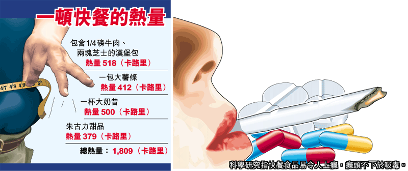 吃得太多快餐食物容易令人肥胖,麥當勞和肯德基等美國快餐店都說這是「個人責任」,但美國和英國研究發現,含高脂肪和高糖量的食物,例如漢堡包和朱古力,會令人像吸食尼古丁甚至毒品般上癮,自此愈吃愈多,不能自拔,導致癡肥。