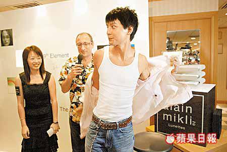 吳彥祖、樋口明日嘉及歐陽妙芝前晚出席眼鏡宣傳活動,法籍眼鏡設計師AlainMikli熱情無限,他除了攬着歐陽妙芝和挑逗樋口明日嘉外,又整蠱吳彥祖,要求他先除衫才試戴眼鏡。