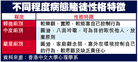 香港中文大學心理學系的一項研究發現,病態賭徒均有病態依賴及抑鬱兩個共通臨床特徵,不同程度的病態賭徒更會出現樂觀、實際及圓滑等不同性格。