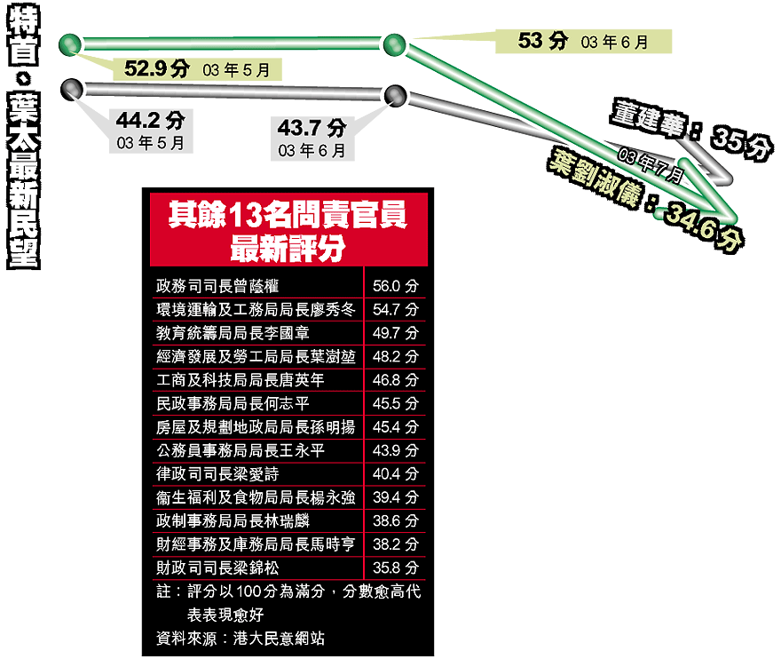 董建華的成績表也不堪入目,獲35分,比上月大跌10.7分。港大民意研究計劃主任鍾庭耀說,評分「插水式下跌」,證明董、劉兩人是民憤的焦點,拖累整個領導班子。
