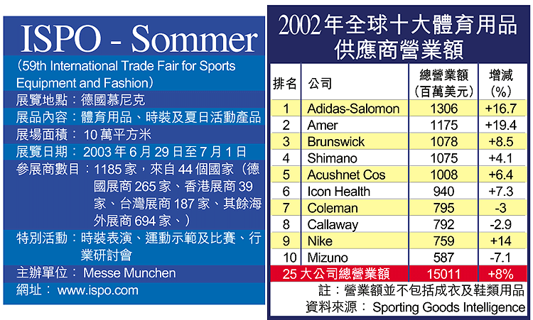 體育運動,已成為現代人不可缺少的日常生活,生產體育用品因而成為一門重要的輕工業,估計每年全球的體育用品批發營業額超過500億美元,而且產品需求不斷增加。故此德國ISPO展覽會,吸引了過千家大大小小的體育用品供應商,目標自然是在這個高增長潛力的市場分一杯羹。