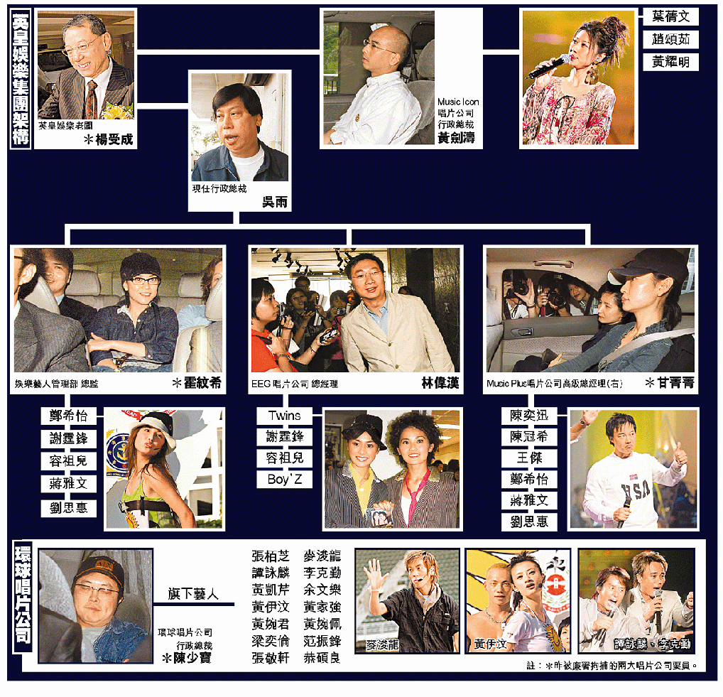 【本報訊】廉政公署就唱片公司涉嫌賄賂電視台職員一事展開調查,昨日帶走了多位唱片公司職員返廉署調查,牽涉的唱片公司有英皇娛樂集團和環球唱片,包括英皇娛樂老闆楊受成、英皇娛樂藝人管理部總監霍紋希、歌星謝霆鋒、英皇娛樂集團旗下唱片公司MusicPlus唱片部高級總經理甘菁菁、英皇娛樂集團旗下另一唱片部以及經理人公司紅音樂「MusicIcon」行政總裁黃劍濤,另外還包括英皇前董事兼行政總裁李進以及環球唱片行政總裁陳少寶,而英皇娛樂集團現任行政總裁吳雨則身在北京。