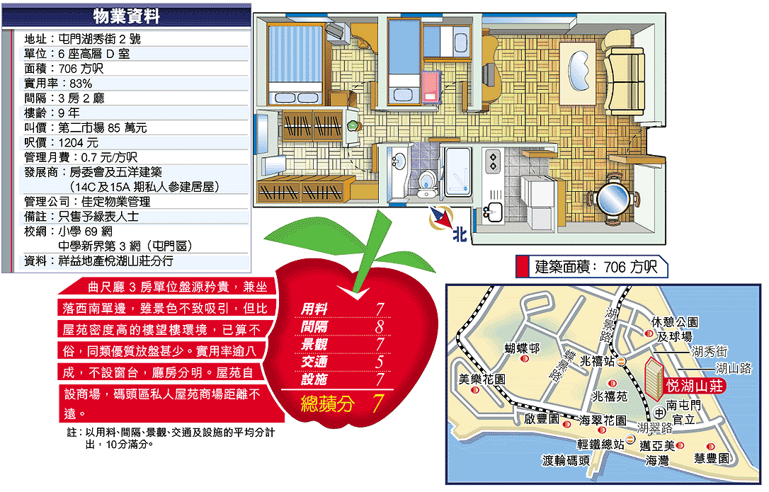 悅湖山莊是屯門碼頭區知名度較高的居屋,鄰近屋苑商場及輕鐵總站,樓齡較新,間隔主打3房設計,對區內綠表換樓客別具吸引力。3房單位分兩類,面積712方呎單位屬呂字廳,每層有4伙,另一款是706方呎曲尺廳設計,每層僅2伙。論空間感及開揚度,以數量較少的曲尺廳單位佔優,個別靚坐向的,造價可較呂字廳單位高近一成。