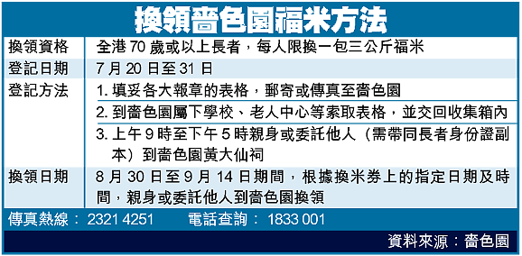【本報訊】每逢有團體免費派米,一眾公公婆婆都不惜在烈日下排隊數小時,嗇色園為免卻長者排隊之苦,所以為下月舉行的派米活動作出特別安排,包括摒除過往先到先得的做法,改為無限額向全港五十八萬九千多名七十歲或以上的長者派贈三公斤的福米,並預先安排登記和指定換領時間。