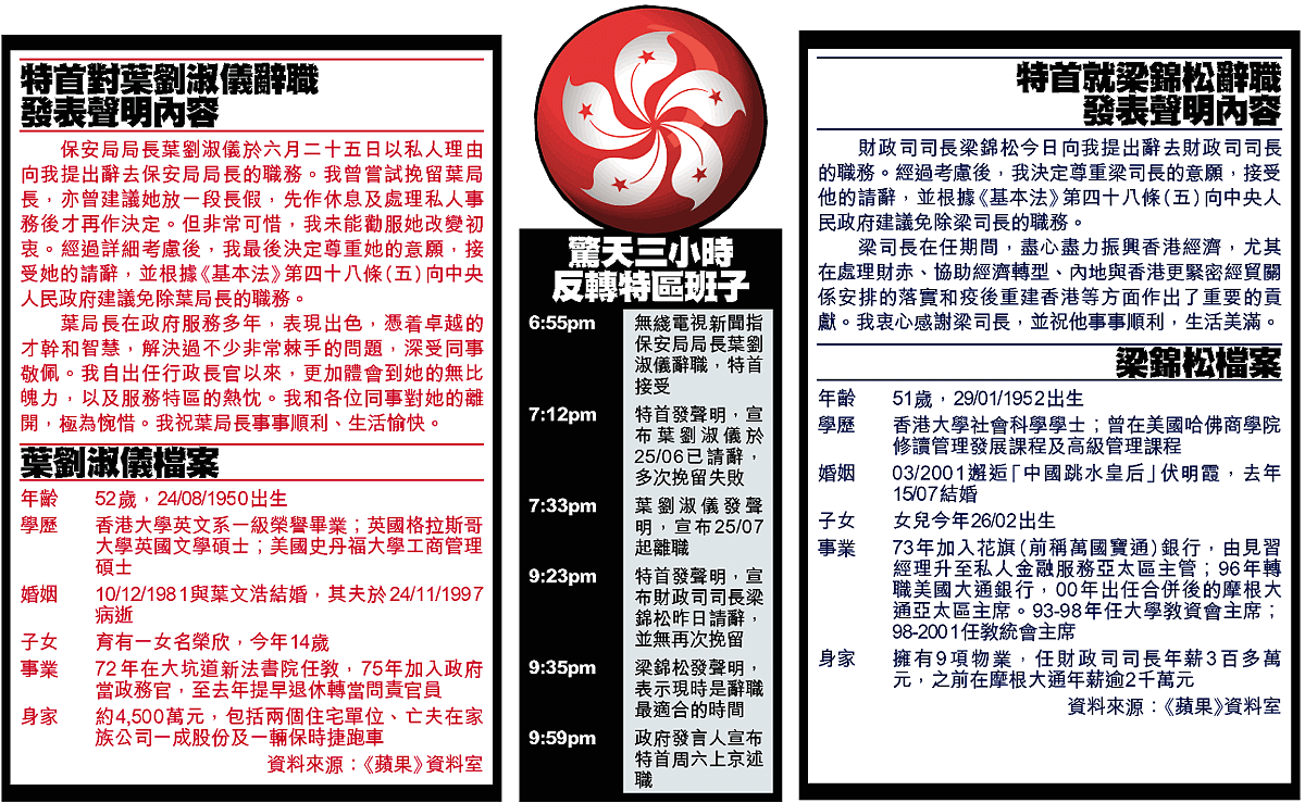 7.1五十萬人大遊行後,記者於七月六日的記者會上,曾向特首提問是否有官員要下台,董建華斬釘截鐵回應無人要下台的聲音言猶在耳,兩名主要官員昨晚卻先後辭職,消息震撼全港。董建華昨晚七時十二分發表聲明,表示葉劉淑儀於六月二十五日以私人理由辭職,他挽留不果,最終尊重其意願接受其請辭,她將任職至本月二十五日止。
