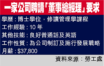 一間位於上環的商業機構,於本月初在勞工處刊登招聘廣告,聘請「董事總經理」。機構對應徵者的要求甚高,除需要具備十年工作經驗外,語文能力(包括普通話及英語)良好、更須持有博士學位,月薪卻只是三萬七千八百元。