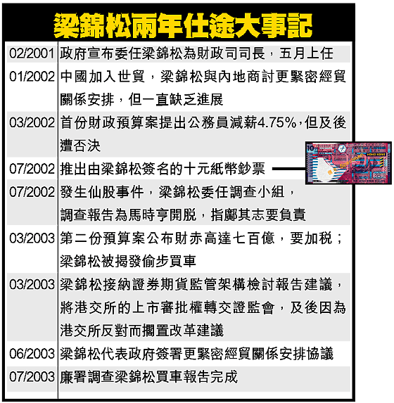 梁錦松出任財政司司長兩年,相信可以「名留千古」的政績,是去年回歸五周年時,推出由他簽名的十元紙幣「花蟹」;其他方面,乏善可陳。至於他任內最後一件大事,是上月底代表港府簽署更緊密經貿關係安排協定。不過,整個談判不算順利,更令他去年五月突然取消到北京商談的會議。據悉,促成今次緊貿安排成事的是特首董建華,以及北京新政府的支持。有政界人士稱,梁錦松任內從未到北京述職,或多或少可說明他與北京的關係。