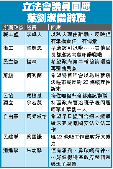 職工盟的立法會議員李卓人直斥,葉劉淑儀以私人理由提出請辭,反映她沒有就其「霸王硬上弓」推銷23條承擔責任,沒有任何悔意;而董建華讚揚葉太表現出色,亦反映高官問責制其實是「高官保護制」,完全沒有回應民意訴求。