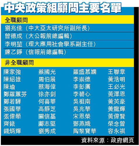 中央政策組一直是特首、政務司司長及財政司司長智囊機構,除了首席顧問劉兆佳、顧問曾德成、練乙錚及李明堃外,其他成員是來自社會上不同階層的非全職顧問。