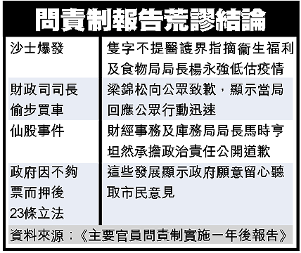 【本報訊】問責制實施剛一年,民間怨聲載道,兩名不得民心的問責官員黯然下台,但政府昨日發表的問責制檢討報告,不但沒有就偷步買車、沙士失誤及硬推23條等事件作出深入檢討,仍自吹自擂指官員承擔政治責任方面,問責制是一個進步。有學者直指報告將問責制描繪成多數人都滿意,「嘥大家時間!」