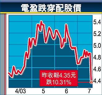 【本報訊】電盈(008)昨日配股後復牌,受到配股價大幅折讓,以及美國科技股大跌拖累,股價瞬即跌破配股價4.4元,更一度低見合併以來新低4.275元。雖然電盈主席李澤楷昨日在市場吸納了1072.4萬股,但仍無力扭轉跌勢,最後收報4.35元,跌10.31%。