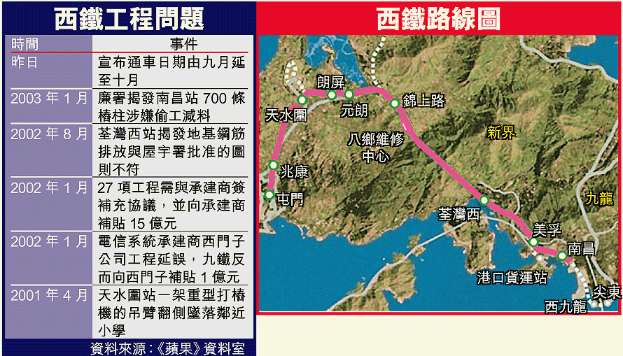 【本報訊】耗資四百多億元興建的西鐵再生波折,幾個月前還誇口宣稱西鐵可在九月底通車的九廣鐵路公司行政總裁楊啟彥,昨日突然改口承認西鐵在試車時出現二十多項問題,主要是訊號系統未能銜接,列車「行行下」會自動停駛,故要押後至十月才通車;立法會議員批評,西鐵延遲通車,九鐵的損失可能高達一億元,必須有人為此負責。 記者:徐岱靈、麥志榮