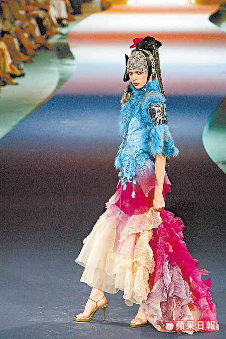 二○○三秋冬ChristianLacroixHauteCouture作品,可說是法式宮廷與西班牙flamenco吉卜賽舞蹈節奏的混合版本,最濃烈的色彩如桃紅色、彩藍色、螢光綠色等明刀明槍地狙擊淡淡的粉色、黑色與白色系列。