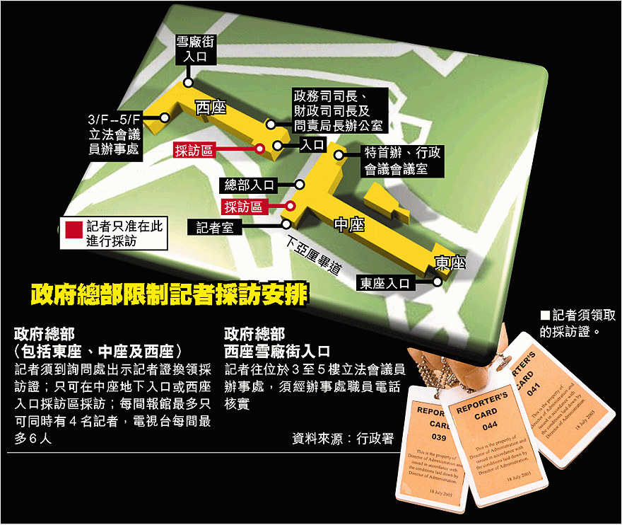 政府由昨日起限制傳媒機構派員前往政府總部採訪的人數,印刷傳媒和電台每間同一時間最多派四人,電視台最多六人。所有記者必須在指定入口出示記者證,換取政府總部採訪證。政府總部中座及西座入口處均以鐵馬劃定採訪區,記者只准在採訪區內進行訪攝,違反規定的記者會被請走。