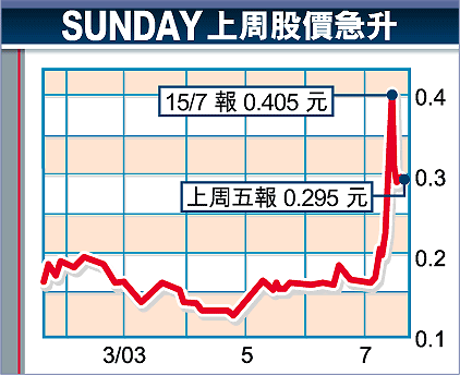 根據公布,富聯期內最後一次增持為7月14日。翌日市場因傳出數碼通(315)擬吞併SUNDAY,刺激兩股造好,SUNDAY於當日股價勁升37.78%,至0.31元;16日其股價更急升至0.405元,截至上周五,SUNDAY收市報0.295元。