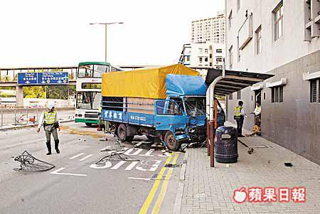 昨清晨六時許,姓張(二十八歲)司機駕駛運蔬菜貨車載同姓廖(二十歲)跟車工人,沿觀塘道向觀塘方向行駛,當駛至近彩石里時,司機事後聲稱因扭軚閃避一輛私家車,致失控鏟上左邊分隔路中的石壆,然後掃毀十二米鐵欄,再橫越毗鄰路面三條行車線撞向路邊巴士站。肇事貨車車頭嚴重損毀,跟車工人雙腳被鐵枝插傷,他事後送院敷治無大礙。