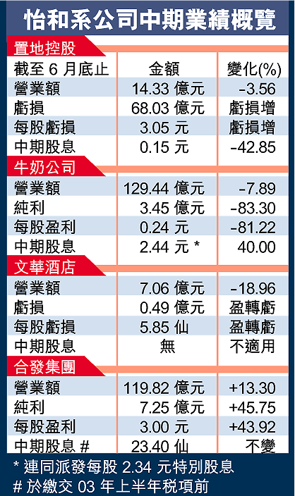 【本報訊】於新加坡上市的怡和系4公司昨日公布截至6月底的中期業績,置地控股表現最差,半年虧損高達68.03億元,主要為旗下物業進行巨額減值。另外,牛奶公司同期純利亦倒退,但決定每股派發2.34元特別股息。