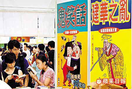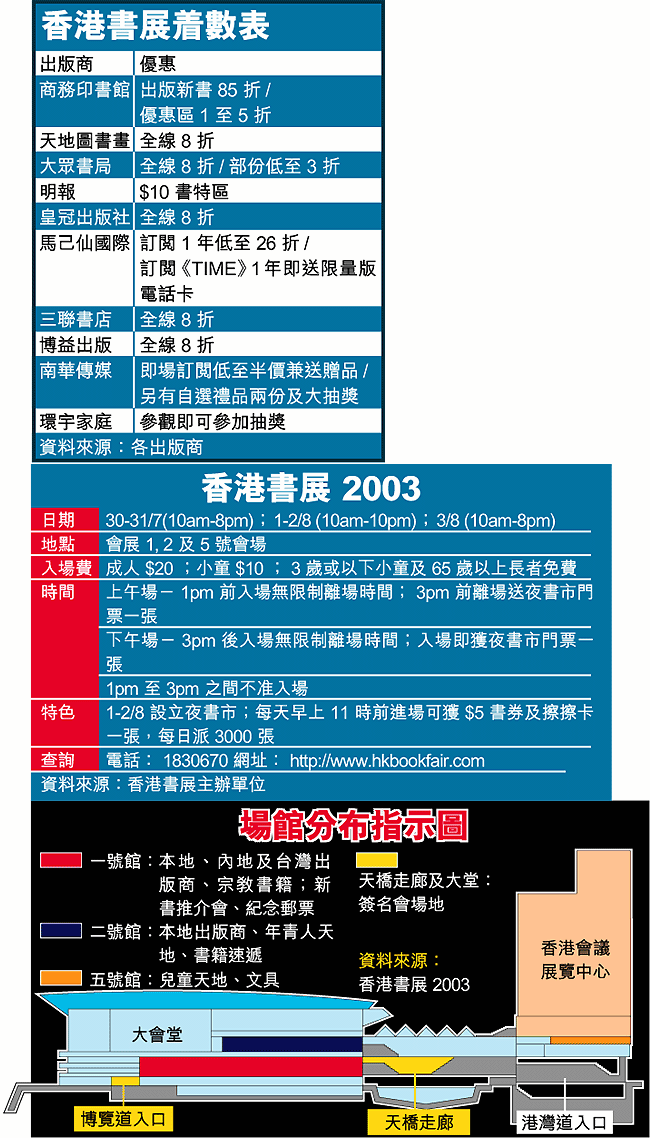港人愈來愈愛看書,從書展每年入場人數遞增可見一斑;香港書展2003昨開鑼,已吸引數以萬計捧場客。從書展中受追捧的書籍可一窺社會現象──五十萬人參與7.1大遊行後,連我們下一代亦受薰陶,對政治漫畫大感興趣。 記者:翁煜雄、李駿慧、鄭佩琪