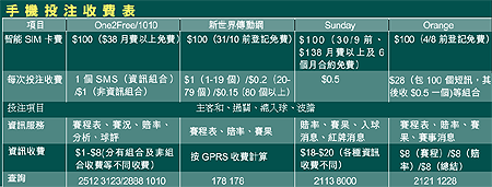 8月1日對足球迷絕對係一個大日子,因為今日終於可以正式合法賭波喇,各位球迷除了可以去馬會投注外,用手機都一樣得,全港七間網絡商現時已經有五間(Orange、1010、One2Free、新世界及Sunday)推出手機足球投注服務,由主客和、入球、波膽及過關都有得玩。不過想玩手機投注除了要登記,重要換張具有投注功能之SIM卡,不過現時網絡商為吸引更多用戶登記投注,都會免費換畀你。除了用手機投注,網絡商更利用其資訊優勢,兼備各種足球資訊下載服務,讓你掌握第一手足球資訊,就算唔賭波都一樣啱使。