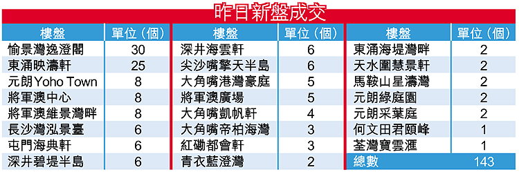 昨日的新盤市場成交,除香港興業(480)首日進行內部認購的愉景灣逸澄閣,及長江實業(001)的東涌映濤軒公布售出30及25個單位外,其餘樓盤銷量只錄得個位數字,特別日前才正式發售的何文田豪宅君頤峰,只售出1個第8座中層單位。