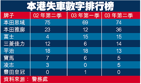 【本報訊】警方最新數字顯示,今年第二季失車案共有六百多宗,較上季的五百八十多宗微升百分之四,其中本田思域繼續是最易成為竊匪目標的車款,且由上季的六十九宗增至七十四宗;本田雅廓再度攀升為失車排行榜的第二位;富士則名列第三,失車數字較去年同季增加近三倍(見表)。