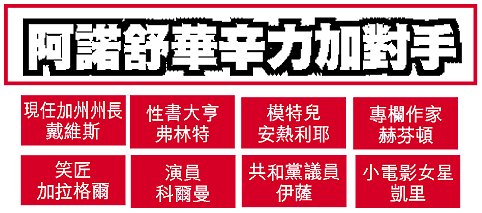 阿諾憑冷面「大隻佬」形象深入民心。挾着《未來戰士》第三集《殲滅者TX》賣座的聲威,他角逐加州州長的消息近數周來傳得沸騰。也不知是否要營造石破天驚的勢頭,直至周三早上,他的政治顧問還聲稱他因妻子不贊成,傾向不參選。